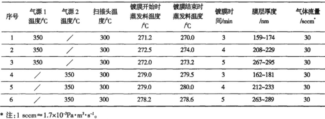 利用研制的实验装置, 参考 OLED器件生产中的部分工艺参数进行了一系列工艺实验, 验证 OVPD在 OLED蒸镀实验装置中应用的可行性。蒸镀材料为 Alq3 ( 蒸发源 1) 和 NPB ( 蒸发源 2) ; 气源为高纯氮气;ITO 基片玻璃尺寸为 370.0 mm× 470.0 mm× 1.1 mm。工艺参数及实验结果见下表。